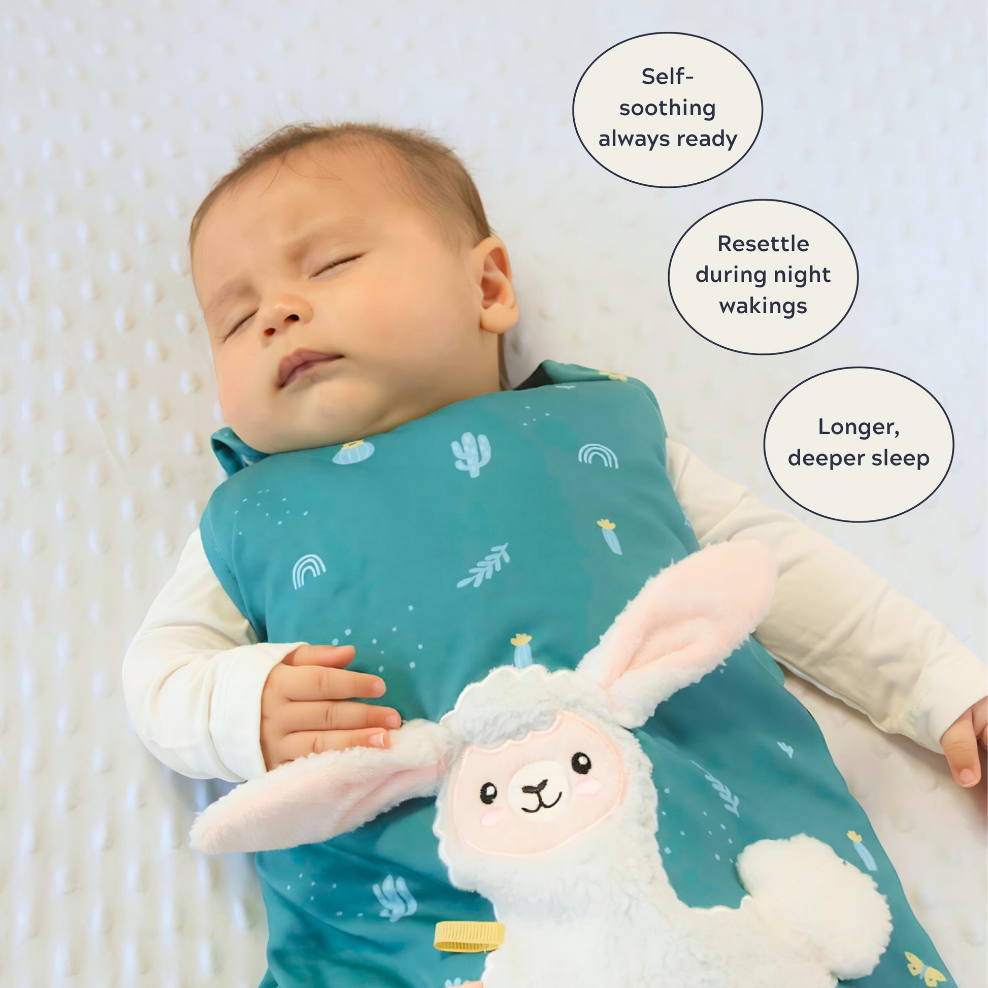 We solved the one thing other sleep sacks don't. Our unique design features a permanently attached lovey, giving your baby a safe, always-within-reach tool to self-soothe.